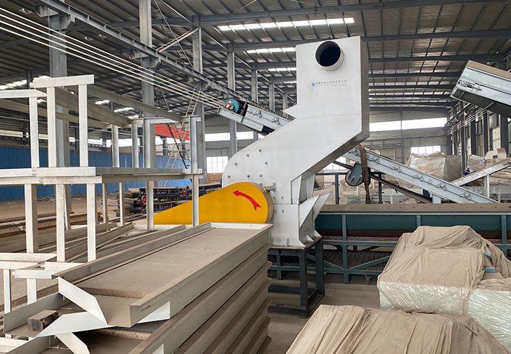 破碎線主機(jī)殼體采用特厚鋼板制造,內(nèi)襯為高錳鑄鋼件,可更換;主機(jī)轉(zhuǎn)子盤安裝于水平軸上,轉(zhuǎn)子盤圓周分布有銷軸,軸向懸有錘頭;主軸用滾珠軸承支撐,循環(huán)油強(qiáng)制潤(rùn)滑冷卻,并裝有溫度傳感器;進(jìn)料口裝有液壓輥筒喂料裝置,位置一高一低,同向旋轉(zhuǎn),能將大件松散物料壓扁,送入破碎腔內(nèi)。