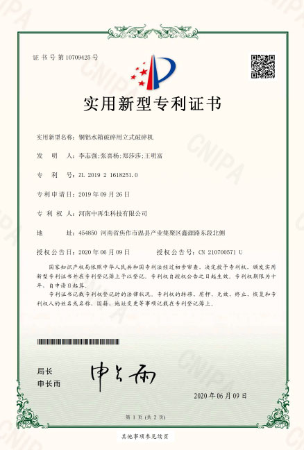 ZL2019216182510銅鋁水箱破碎用立式破碎機